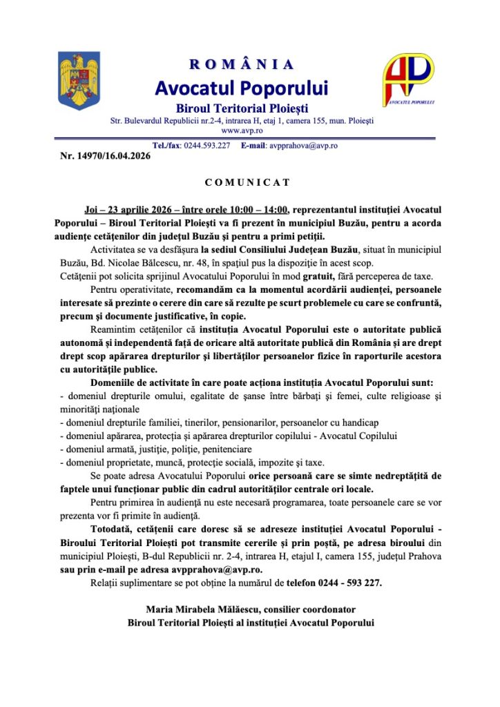 Comunicat – Audiente Avocatul Poporului in data de 23.04.2026